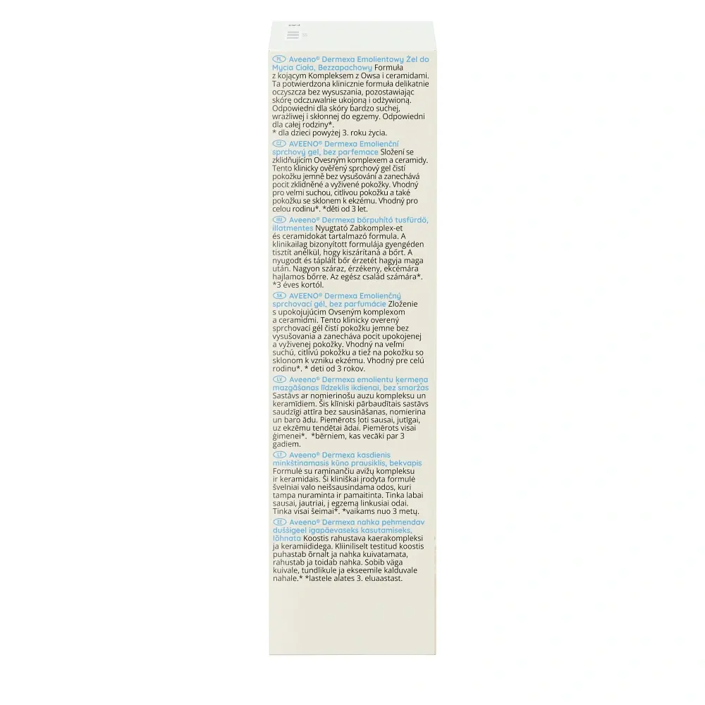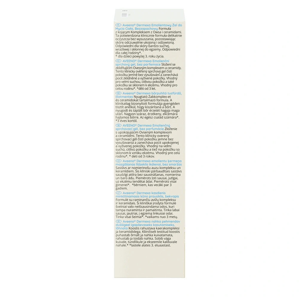 Aveeno® Dermexa Emolientowy żel do mycia ciała został opracowany na bazie łagodzącego kompleksu owsa i ceramidów. Sprawdzona klinicznie, wegańska* formuła o wysokiej tolerancji delikatnie oczyszcza bez wysuszania, pozostawiając skórę odczuwalnie ukojoną i odżywioną. Aveeno® Dermexa Emolientowy żel do mycia ciała łagodzi i chroni bardzo suchą, wrażliwą i swędzącą skórę. Jest odpowiedni dla całej rodziny** - a jego formuła jest bezzapachowa, nie zawiera mydła i jest w 98% biodegradowalna. Jest odpowiedni również dla osób ze skłonnością do chorób skóry, takich jak egzema.